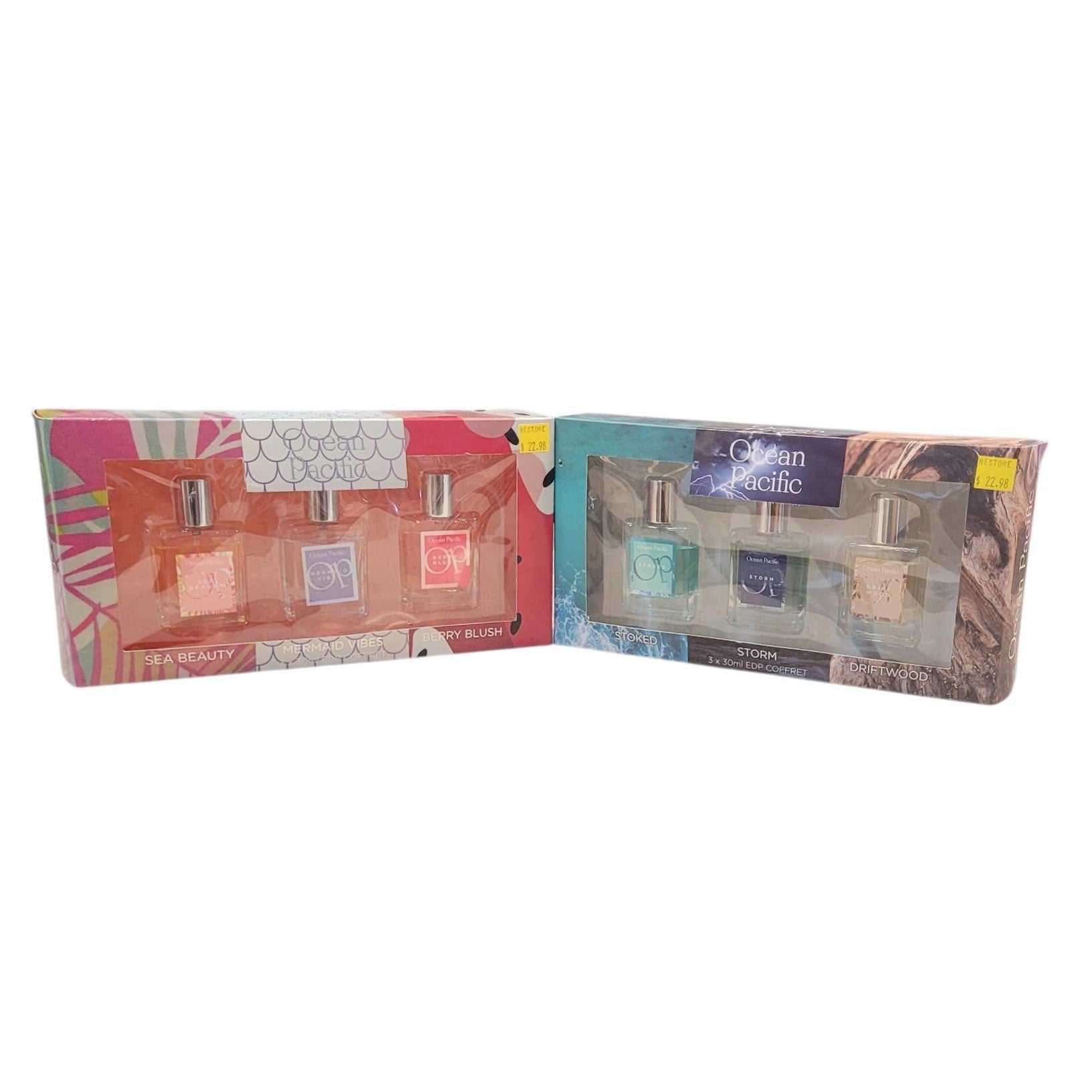 This Ocean Pacific set features three travel-size women's fragrances-- Sea Beauty, Mermaid Vibes, and Berry Blush - A bright, feel-good fragrance inspired by glowing skin, pink sunsets, and the promise of a beautiful day ahead.